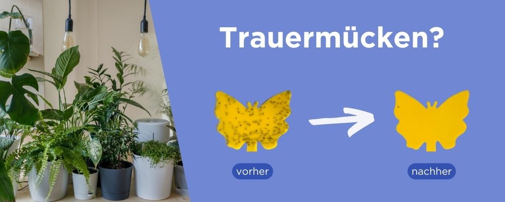 Die Lösung gegen Trauermücken fanden wir in der Kombination von Gelbstickern und einem Gießmittel. Die Gelbsticker bekämpfen die erwachsenen Trauermücken, und verhindern damit, dass Sie neue Larven in den Pflanzen ablegen können. Das Trauermücken-Gießmittel tötet dabei aktiv die Larven in der Erde der Topfpflanzen ab, sodass keine neuen Mücken heranwachsen können.